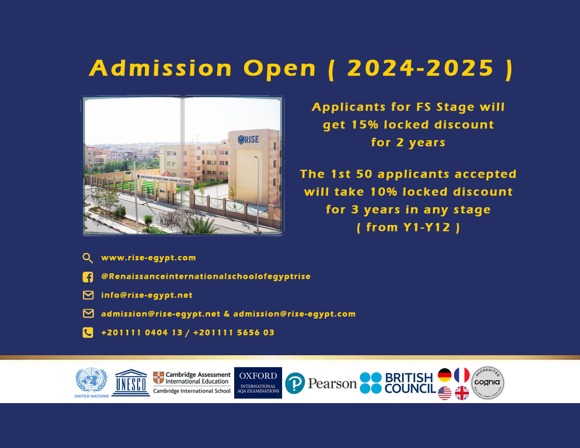 As a parent, you seek support, advice, and guidance concerning your child’s education, which is why we at RISE do our best to provide this. We aim to blend the well-known highly respected scrupulous British education through the Cambridge Curriculum, within a learning environment that is positive, constructive and fun. We want to serve our pupils and their parents to our best abilities and use our expertise to deliver the very best of British education to Egyptian families as well as non-Egyptians.